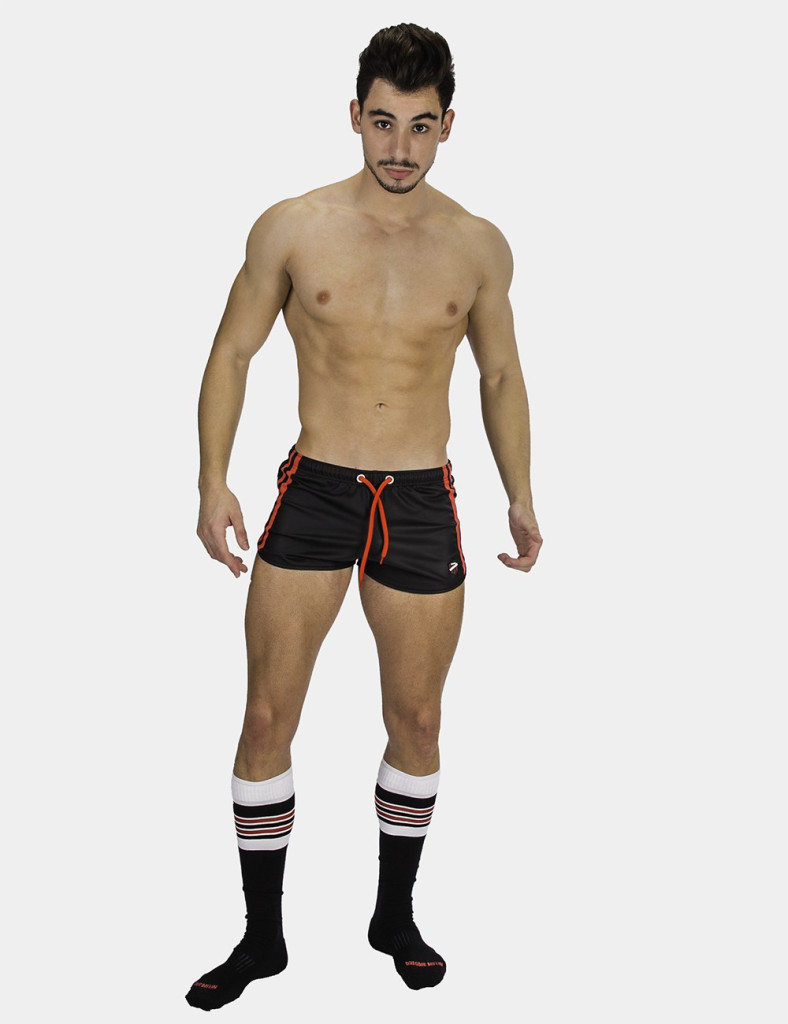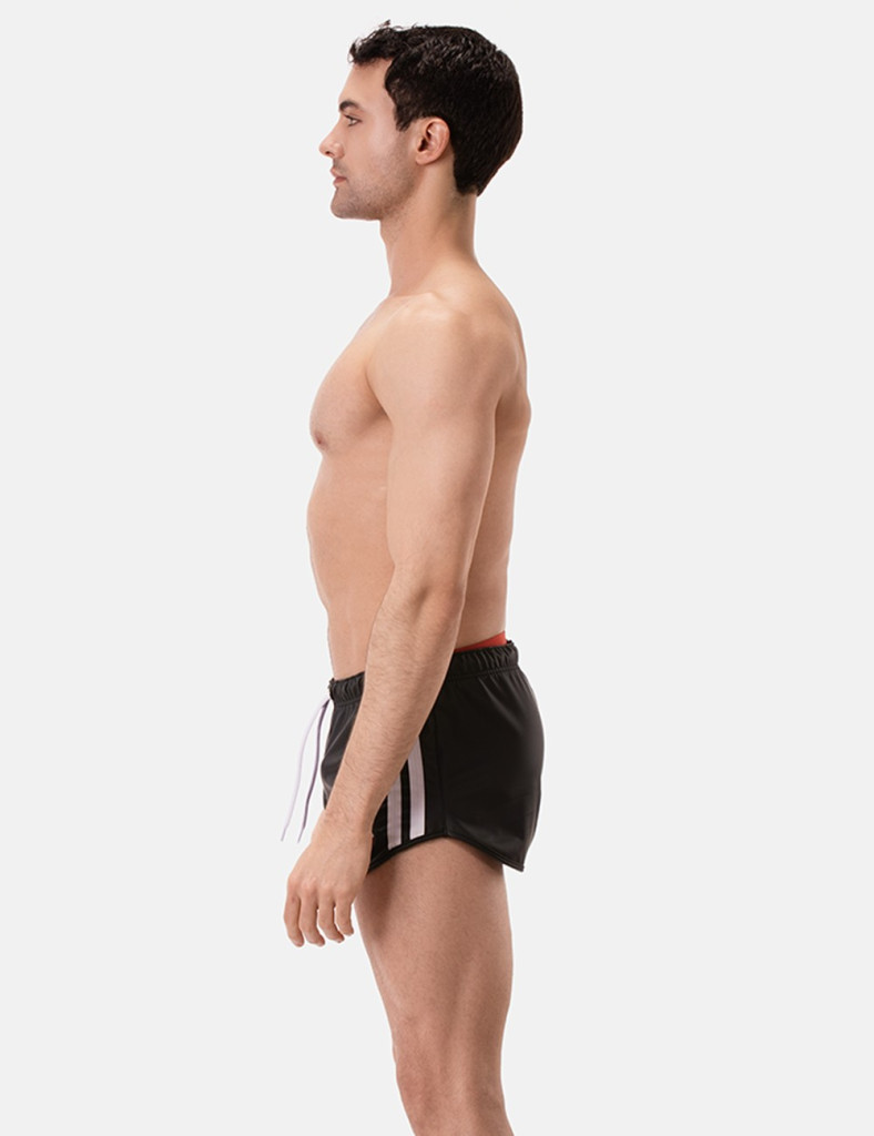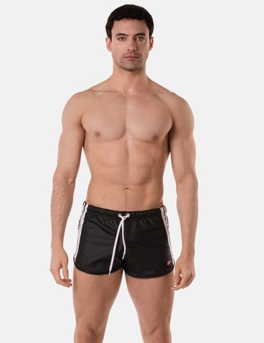 Korte broek. Leerachtige, contrasterende koords en zijband.
