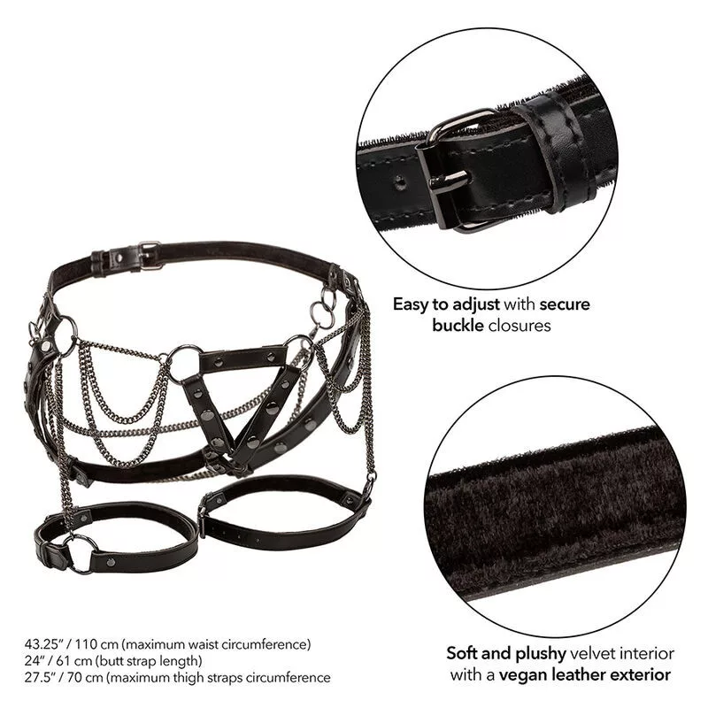 Rugalmasan alakítható, a derékon és combján állítható pántokkal rendelkezik, így szoros, kényelmes illeszkedést biztosít. A láncok vizuális hatást és csábító súlyt adnak, fokozva az érzékszervi élményt. Puha, puha bársonysal bélelve, sima simogatást nyújt a bőrön, kontrasztban állva a vegán bőr külső oldalával.
