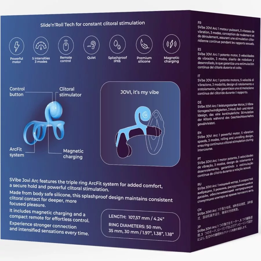 Az SVibe Jovi Arc fejlett ArcFit háromgyűrűs rendszerrel rendelkezik, amely kivételes illeszkedést biztosít, amely a kényelem, stabilitás és biztonságos támogatás mellett működik. Ennek az innovatív szerkezetnek köszönhetően a gyűrű szilárdan a helyén marad, lehetővé téve, hogy erőteljes, közvetlen és következetes klitorális stimulációt élvezhess folyamatos igazítás nélkül.