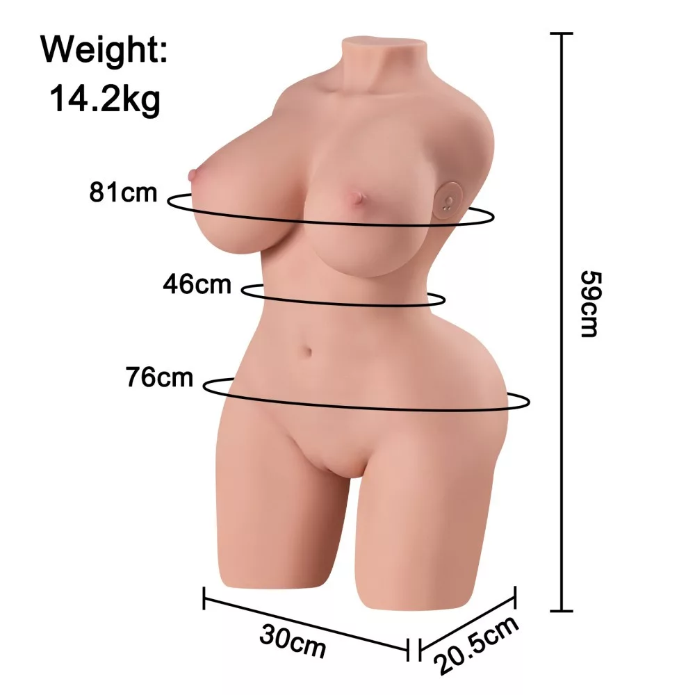 Hoge kwaliteit, zacht, gemaakt van leerachtig materiaal, aanbevolen voor mannen, met borsten, vagina-vormig Erotisch speelgoed met een lichaamsopening met 3 vibratie- en 4 bewegende functies. Buste 81 cm, heupomtrek 76 cm, tailleband 46 cm.