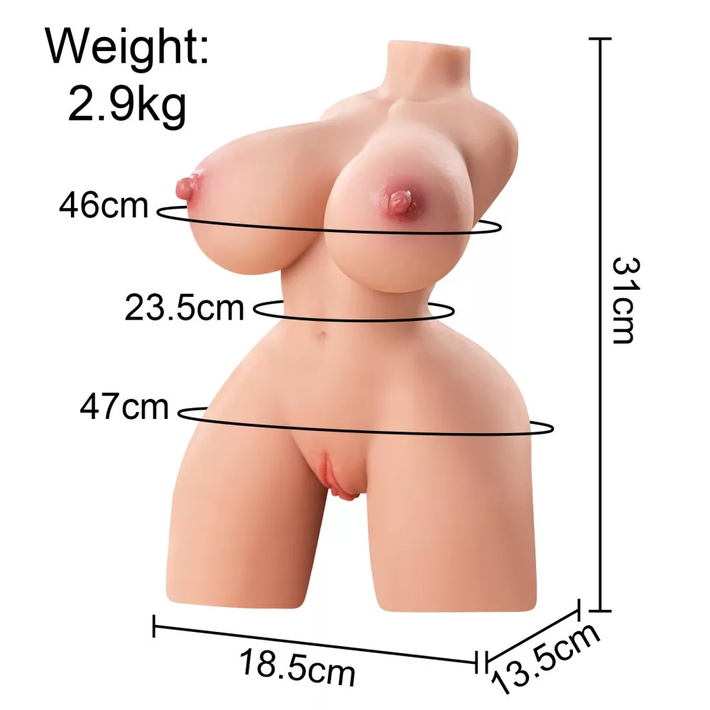 Gemaakt van hoogwaardige, zachte, leerachtige stof, Aanbevolen voor mannen, met een opening in de vorm van borst, vagina en anus Ontworpen erotisch spel. Met behulp van Zelfbeheersing tijdens de gemeenschap kan sterk worden verbeterd, dus het is tijd voor aanzienlijk toegenomen. Het gewicht van het product is 2,9 kg. Hoogte 31 cm, borstomtrek 46 cm, Heupomtrek 47 cm, taillebomtrek 23,5 cm, breedte 18,5 cm.