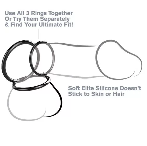 Ftalatátmentes, testbiztonságú Elite szilicone-unkból készült, a három teljesítménygyűrű 1,25" (3,2 cm) és 2" (5,1 cm) között mozog. Találd meg a számodra tökéletes méretet, és tedd a szárad tövére, hogy finoman korlátozd a véráramlást, és segítsd a legnagyobb és legintenzívebb merevedéseket, amiket valaha elképzelt!