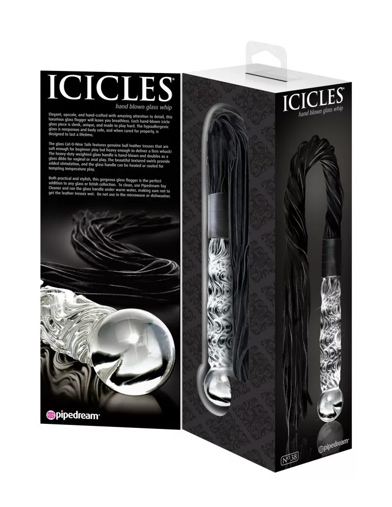 Elegáns, előkelő és kézzel készített korbács, hipallergén bór-szilikát üvegnyéllel, puha, bőr szálakkal.  A nagy teherbírású, súlyozott üvegnyél kézzel fújt, és akár hüvelyi vagy anális behatolásra használható. A termék nem porózus, lehűthető és melegíthető is.